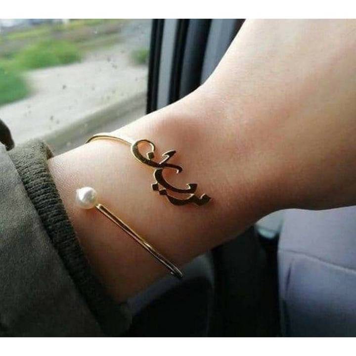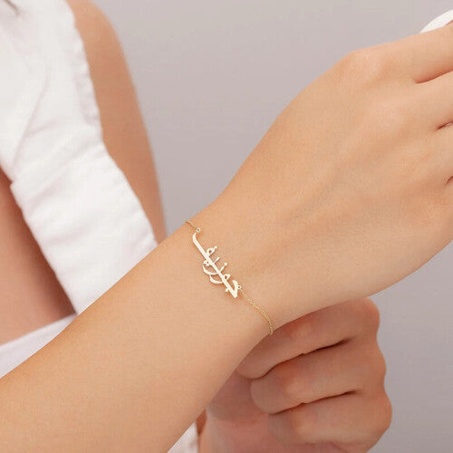 Elegant personalized Arabic name bracelet in a delicate gold finish. A meaningful and stylish accessory, perfect for everyday wear or as a heartfelt gift!
