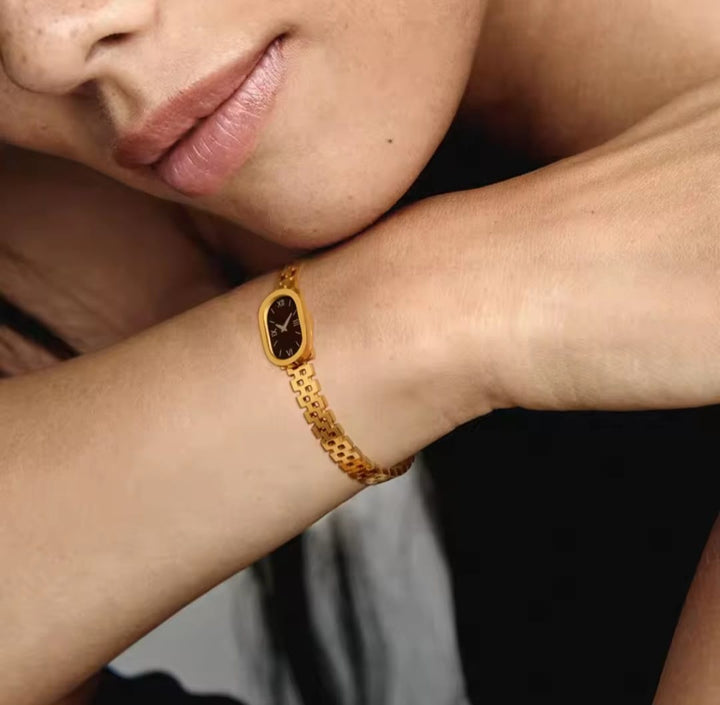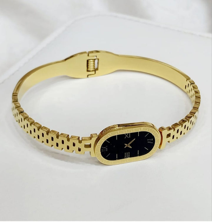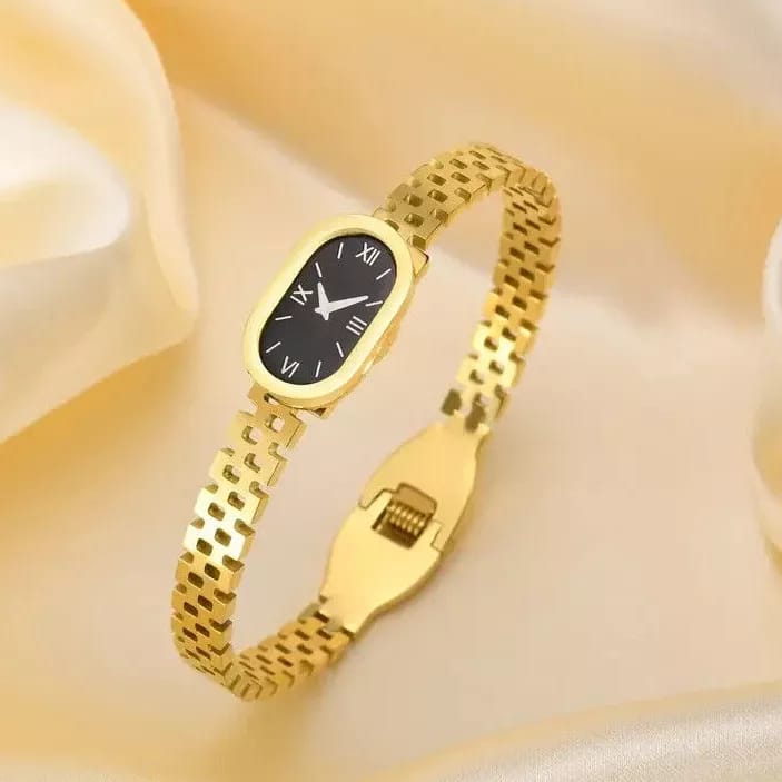 A sleek and sophisticated gold bracelet watch with a black dial and Roman numerals. Perfect for adding a touch of luxury to any outfit!