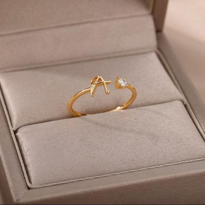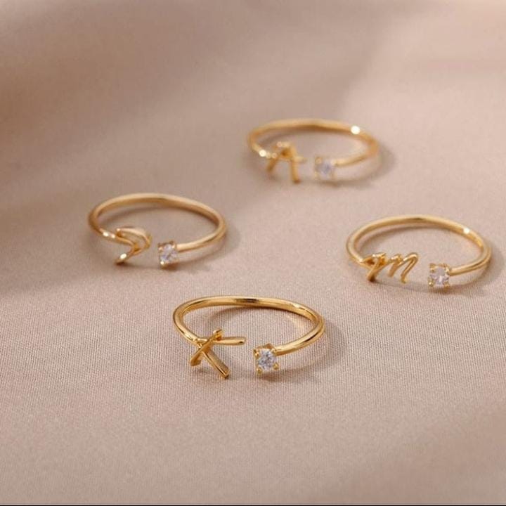 Elegant gold initial rings with a delicate design and sparkling cubic zirconia, perfect for everyday wear or gifting. Adjustable for a comfortable fit