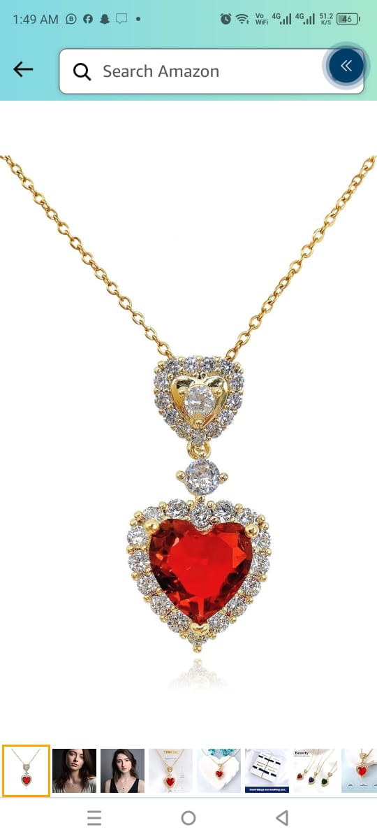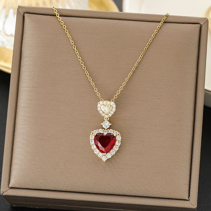 Elegant gold-tone necklace with a dazzling red heart-shaped gemstone, surrounded by shimmering crystals. A perfect statement piece for any occasion