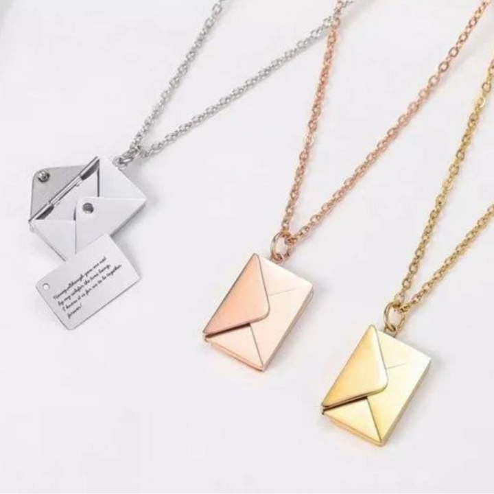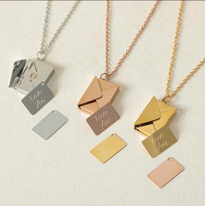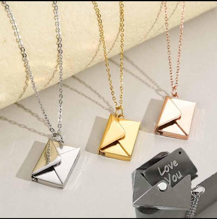 Elegant envelope pendant necklace with a hidden "Love You" message. Available in gold, rose gold, and silver—perfect for a romantic gift or a stylish accessory.